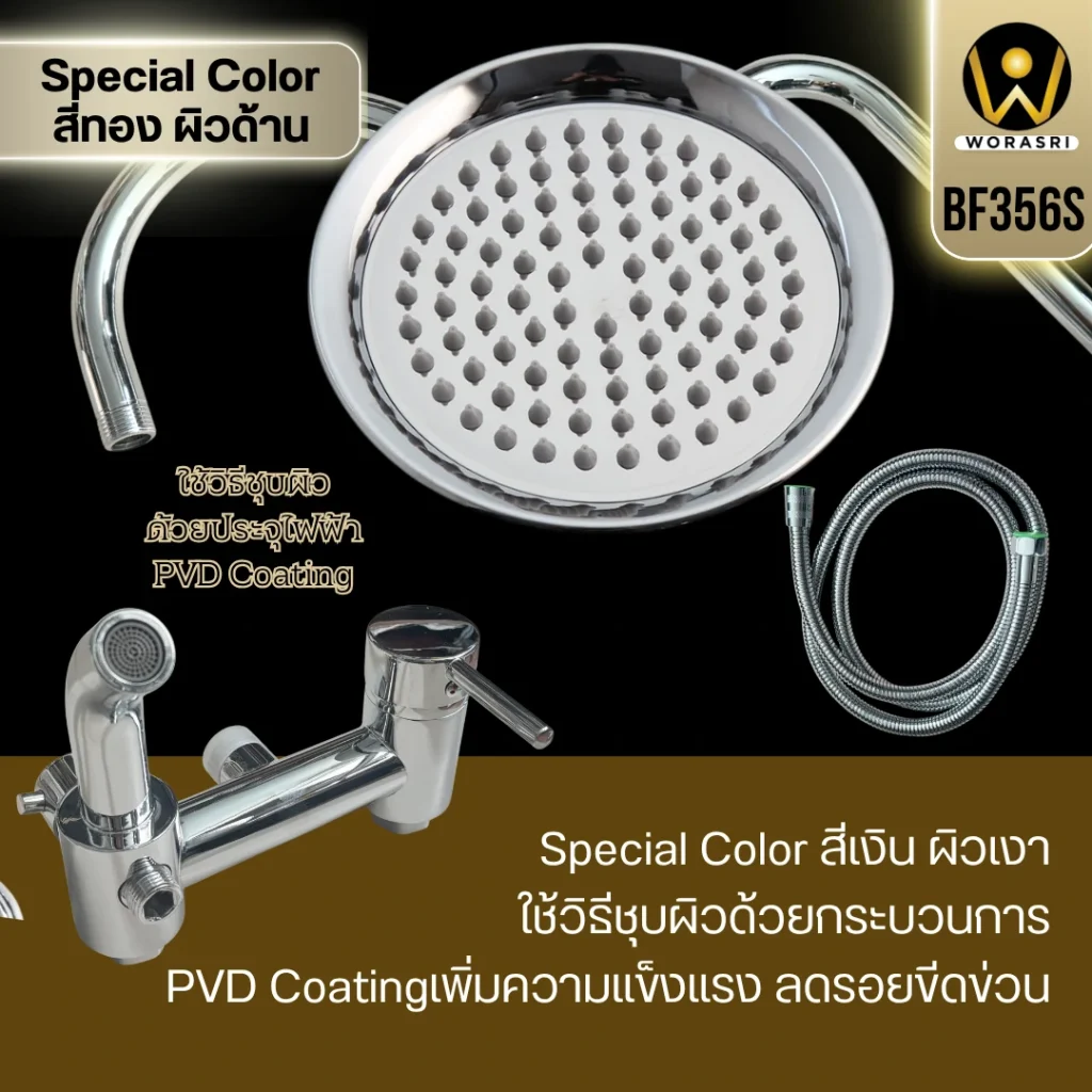 - PVD Coating, Increased hardness (physical vapor depositional) เคลือบฟิลม์เพื่อเพิ่มความแข็งแรงทนทานของหัวฉีดชำระ และยังเป็นกระบวนการที่เป็นมิตรต่อสิ่งแวดล้อมหรือเป็นเทคนิค “การชุบ” มากกว่ากระบวนการเคลือบแบบดั้งเดิม