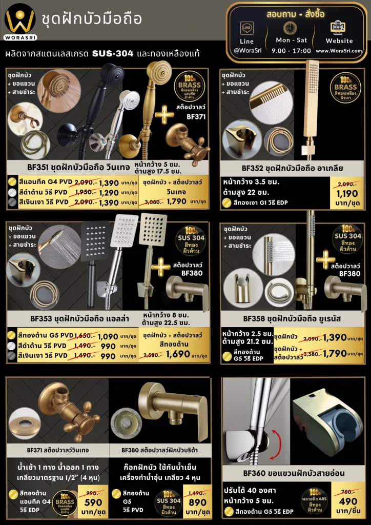 ชุดฝักบัวและก๊อกน้ำเหล่านี้ออกแบบมาเพื่อ ความสะดวกสบายและประสบการณ์การอาบน้ำที่สมบูรณ์แบบ ไม่ว่าจะเป็นฝักบัวก้านแข็ง ฝักบัวสายอ่อน หรือชุดเรนชาวเวอร์ ทุกชิ้นช่วยให้ควบคุมแรงดันน้ำ อุณหภูมิ และทิศทางน้ำได้อย่างง่ายดาย ชุดสายฉีดชำระและที่ฉีดก้นช่วยให้สุขอนามัยดีขึ้น ก๊อกยืนอาบและก๊อกผสมลงอ่างเพิ่มความสะดวกสำหรับการอาบน้ำและผ่อนคลาย ทุกชิ้นทั้งสวยงาม ใช้งานง่าย และทนทาน เหมาะกับบ้าน โรงแรม รีสอร์ท หรือคอนโด