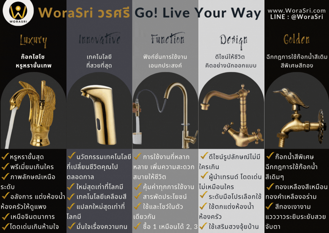 WoraSri วรศรี เป็นโรงงานผู้ผลิต นำเข้าและตัวแทนจำหน่าย จากโรงงานในประเทศไทยและนำเข้าจากจีน ก๊อกน้ำและอุปกรณ์สีพิเศษ ใช้เทคโนโลยีนวัตกรรมผสานกับงานออกแบบ เน้นความเป็นสีทอง หรูหรา มีฟังก์ชันการใช้งานครบถ้วน เปลี่ยนโฉมห้องน้ำห้องครัวให้สวยหรูหราขั้นสุด พรีเมี่ยมเกินใคร เพิ่มดีไซน์ให้ชีวิต คิดอย่างนักออกแบบ โดยยึดพื้นฐานการผลิตและออกแบบทุกผลิตภัณฑ์ ดังนี้