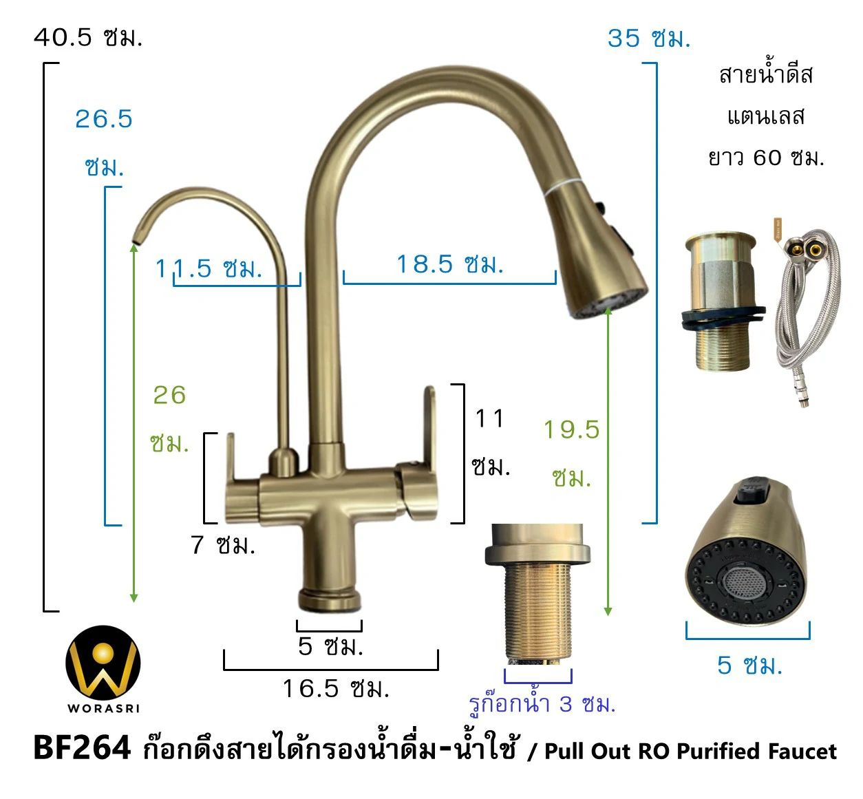 ก๊อกกรองน้ำดื่มดึงสาย2หัวสีทองด้าน BF264 Pull Out with Purified Faucet