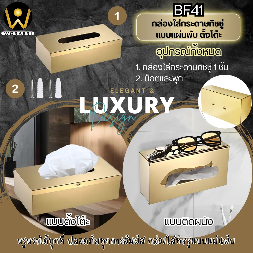 กล่องใส่ทิชชู่แบบแผ่นพับสีทองด้าน ผลิตจากสแตนเลส 201 ทั้งชิ้น มีความแข็งแรงทนทาน รองรับน้ำหนักได้มาก เคลือบสีด้วยกระบวนการ PVD Coating ทำให้วัสดุมีความเงางาม ยึดติดแน่นหนา ทนทานต่อการสึกหรอและมีอายุการใช้งานยาวนาน
