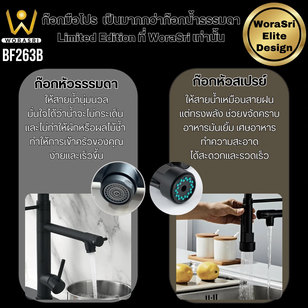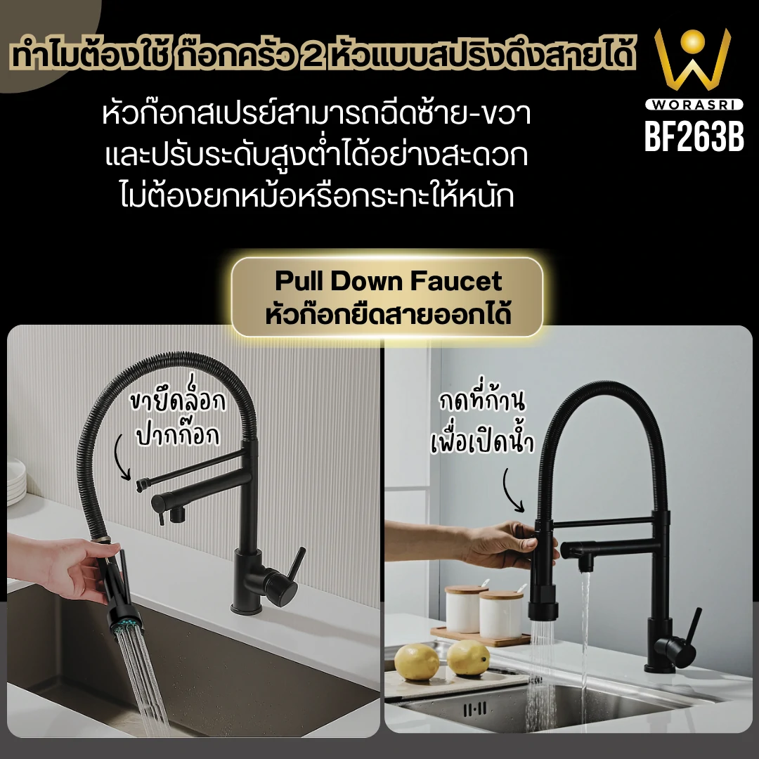 คุณสมบัติเด่น ก๊อกครัว2หัวสปริงดึงโยกสายสีดำด้าน BF263 ดียังไง