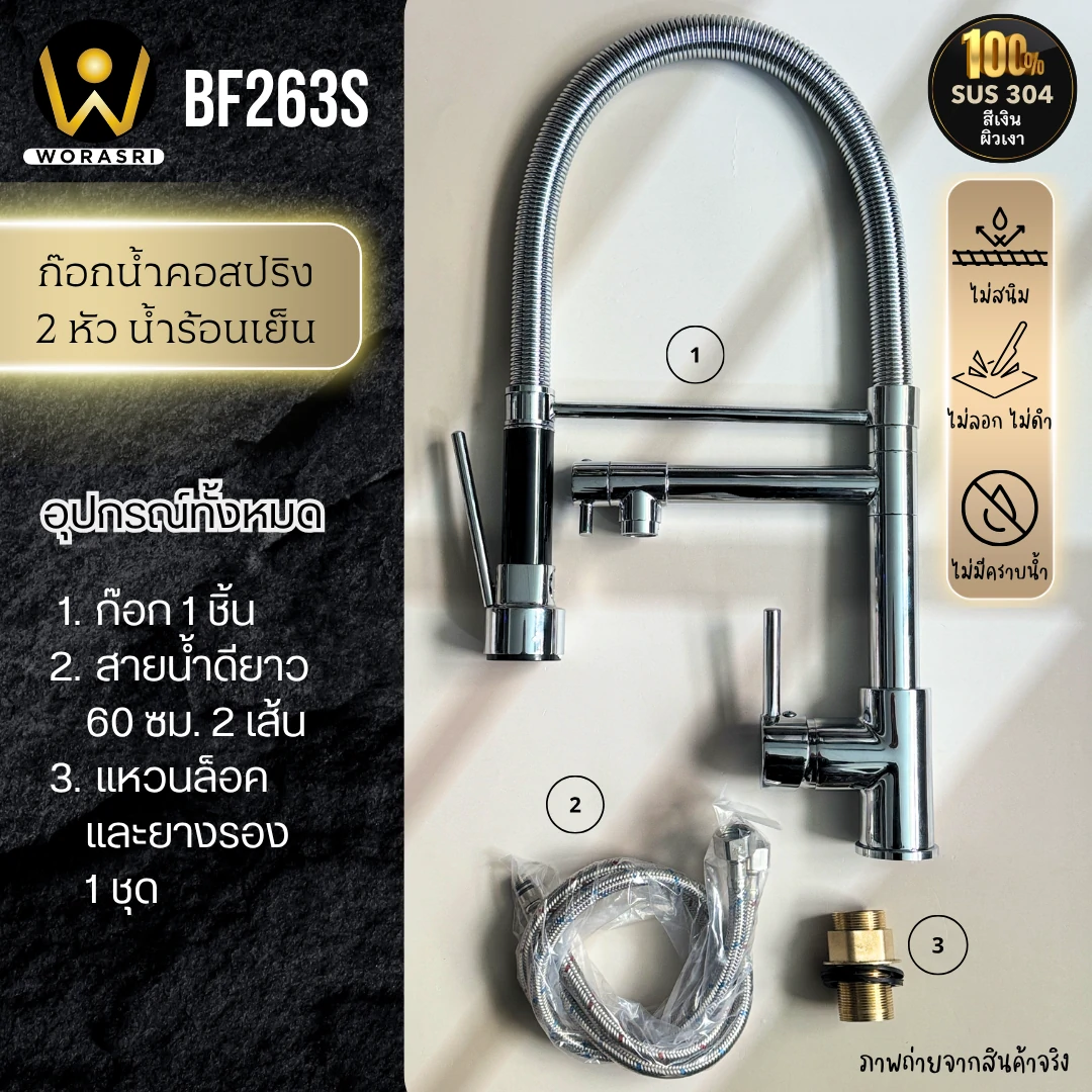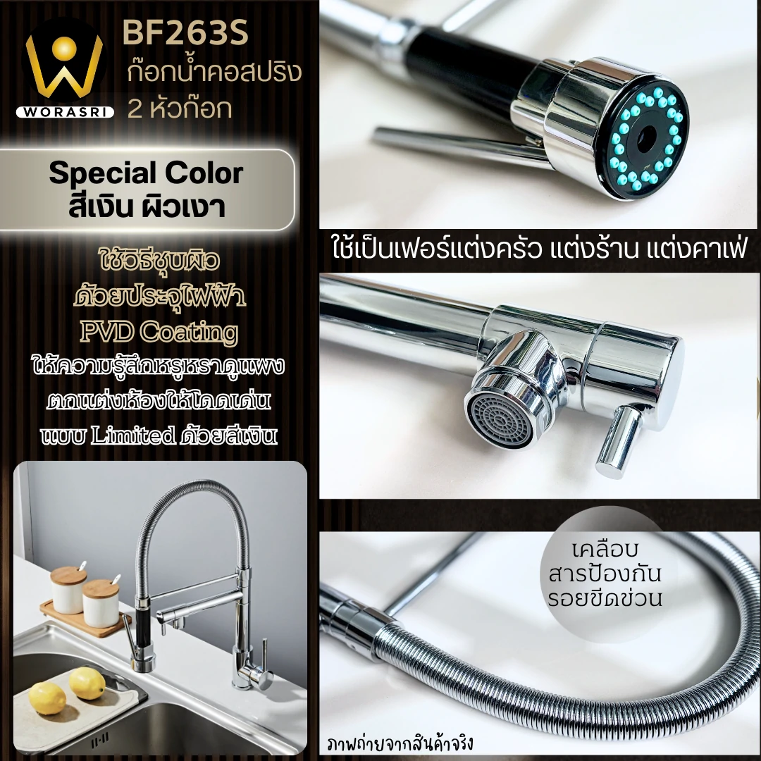 คุณสมบัติเด่น ก๊อกครัว2หัวสปริงดึงโยกสายสีเงินเงา BF263S ดียังไง
