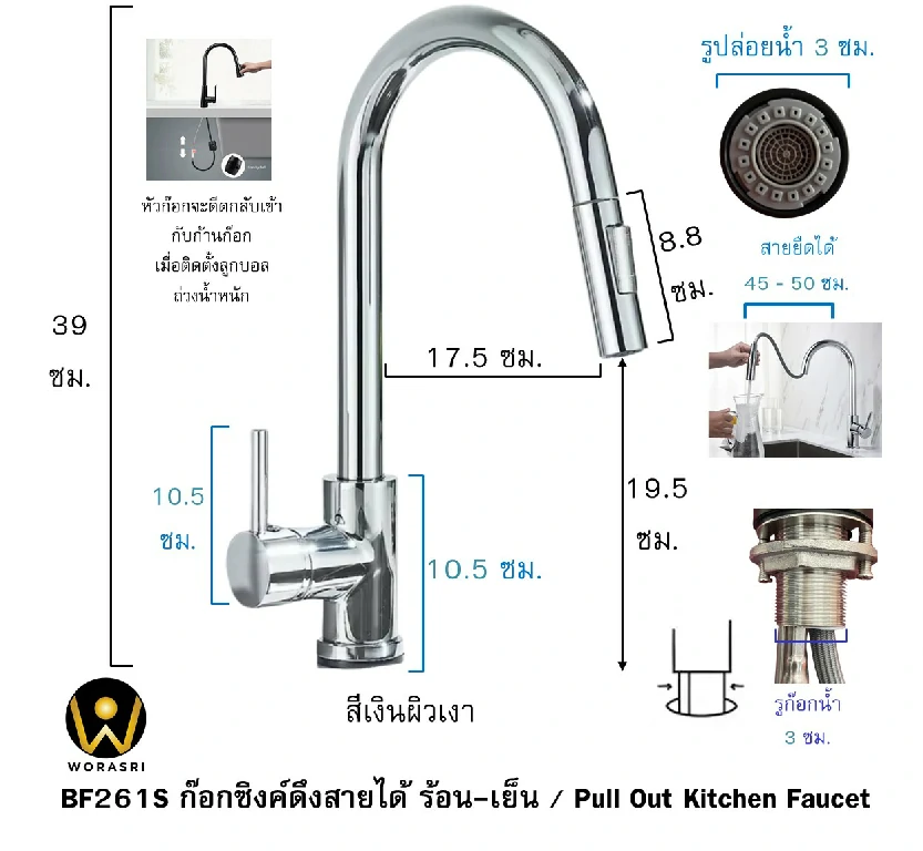 คุณสมบัติเด่น ก๊อกซิงค์ผสมอ่างล้างจานดึงหัวก๊อกยืดสายออกได้สีโครมเงิน BF261S ดียังไง