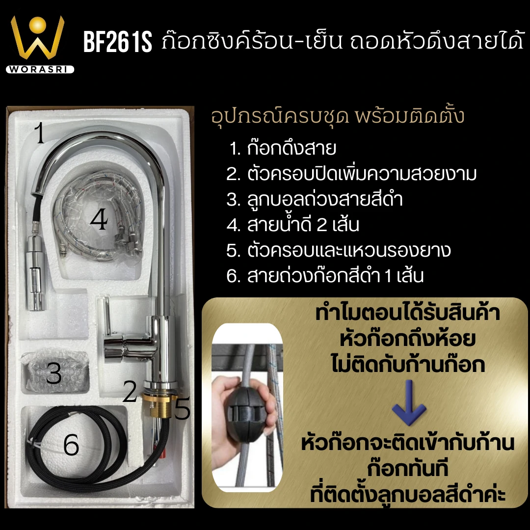 • ทำไมตอนได้รับสินค้าหัวก๊อกถึงห้อยออกมา ไม่ติดกับก้านก๊อก คำตอบคือ หัวก๊อกจะติดเข้ากับก้านก๊อกทันที เมื่อติดตั้งด้วยลูกบอลสีดำ