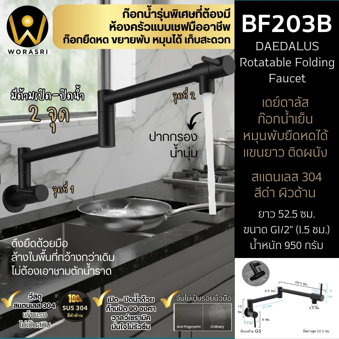ก๊อกซิงค์หมุนพับยืดหดได้ติดผนังสีดำด้าน ยาว 52.5 ซม. Matt Black Rotatable Folding Long Arm Faucet BF203B
