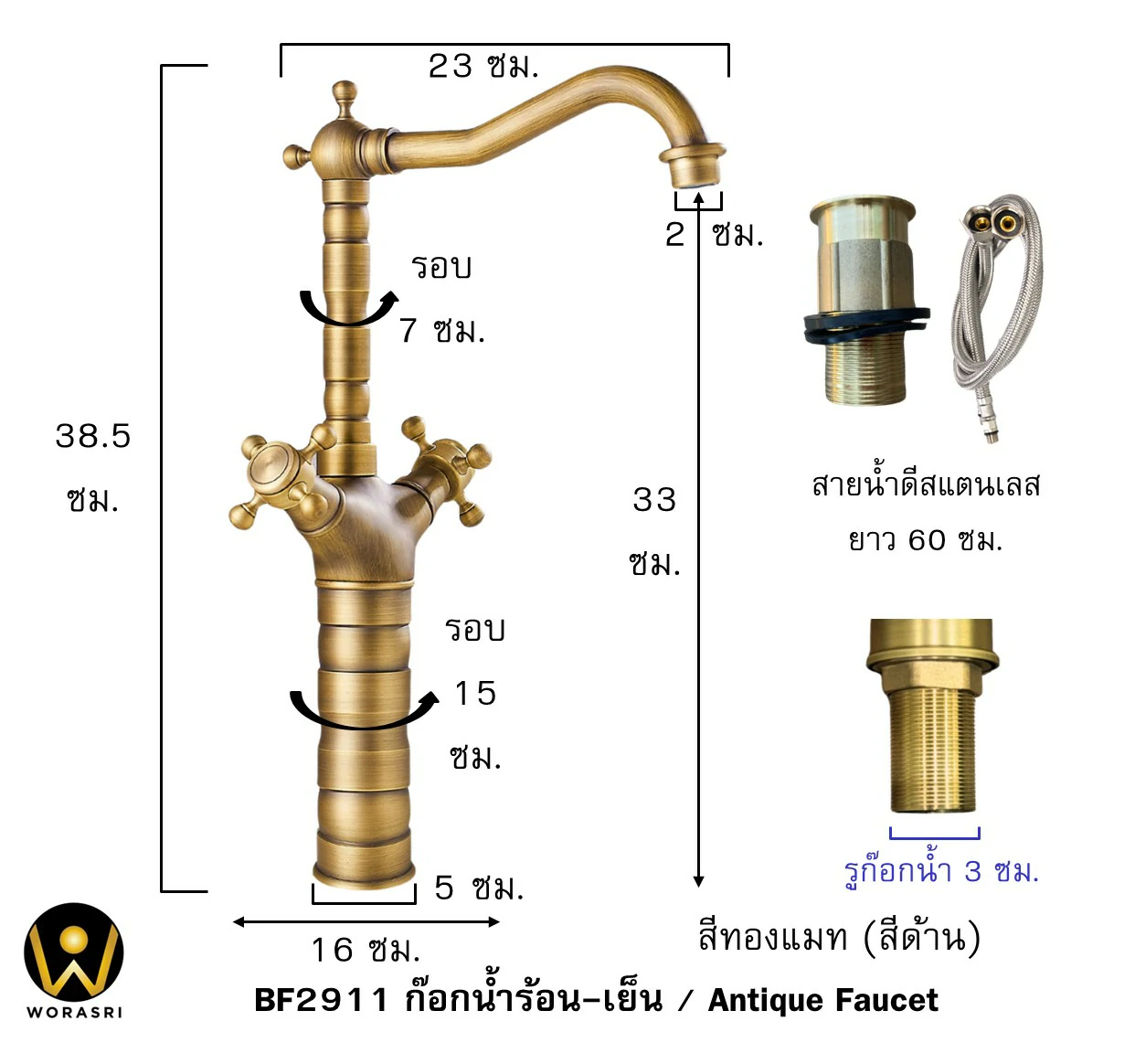 - Size: ขนาดก๊อกผสมน้ำร้อน-เย็นทรงโค้งสูงรูปตัว L วินเทจโบราณ