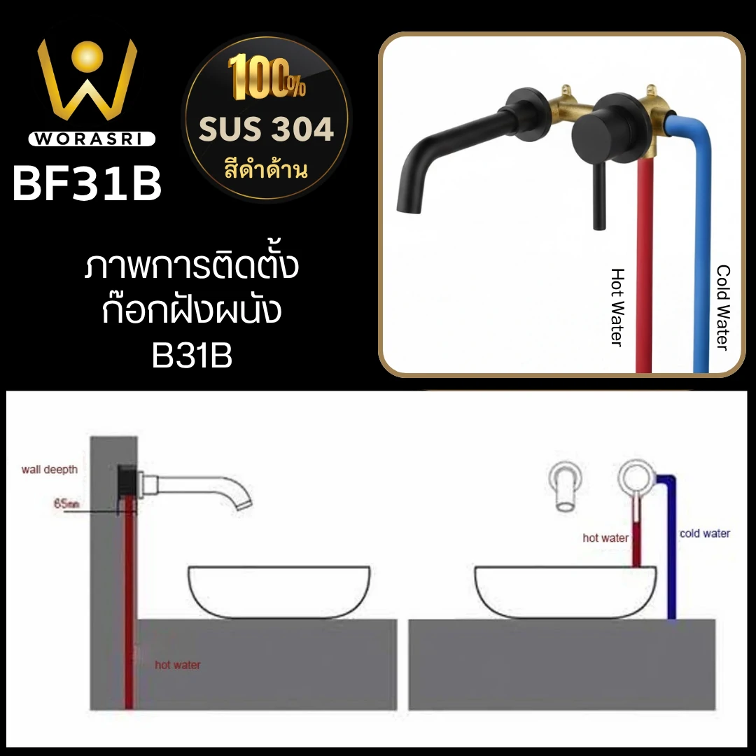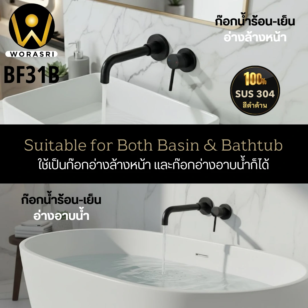 BF31B ก๊อกผสมอ่างล้างหน้าฝังผนัง แบบก้านโยกเดี่ยวสองรู สีดำ ไร้สนิม (Golden Hot and Cold Basin Wall Mount Faucet)