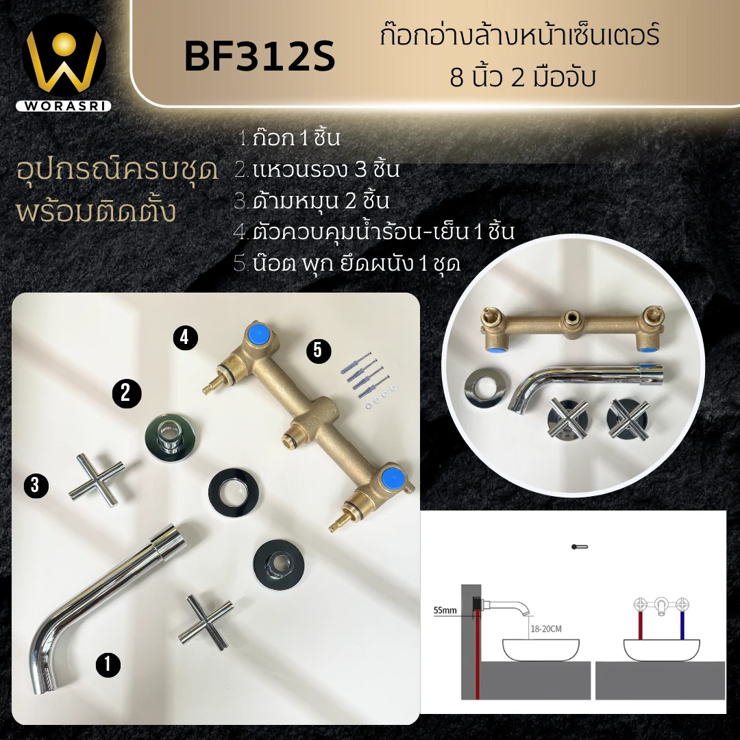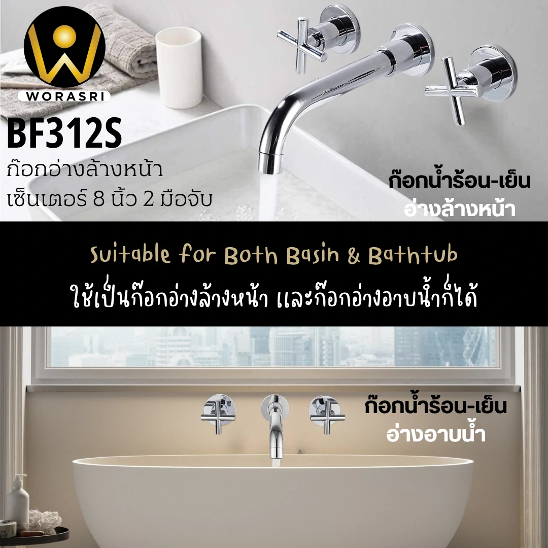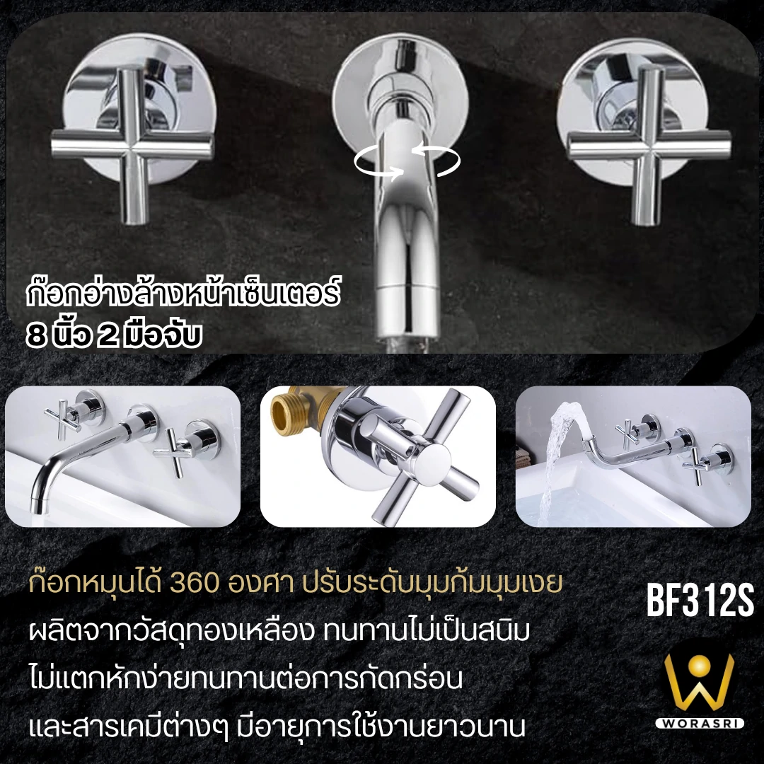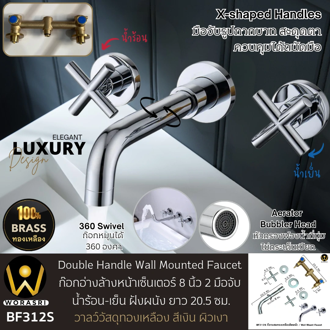 ก๊อกอ่างล้างหน้าเซ็นเตอร์8นิ้ว2มือจับสีเงินผิวเงา แบบบิดรูปกากบาท น้ำร้อน-เย็นฝังผนัง วัสดุทองเหลือง ฺChrome Double Handle Wall Mounted Bathroom Faucet BF312S