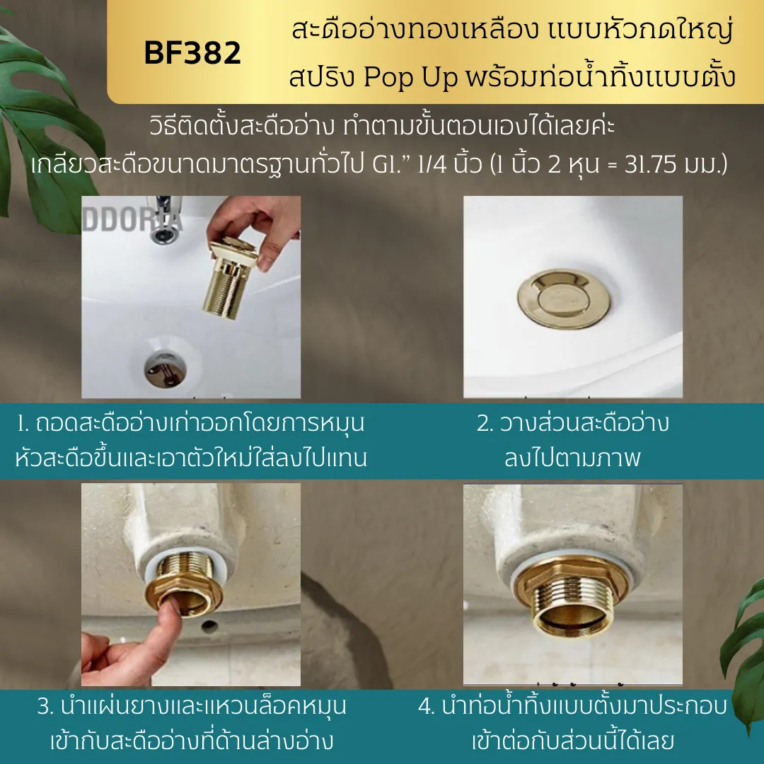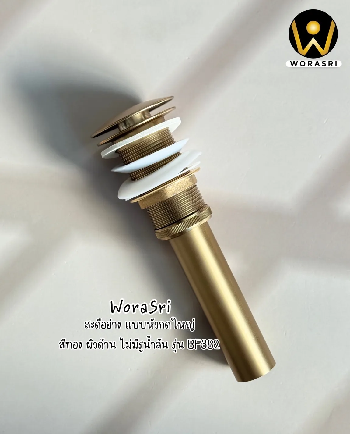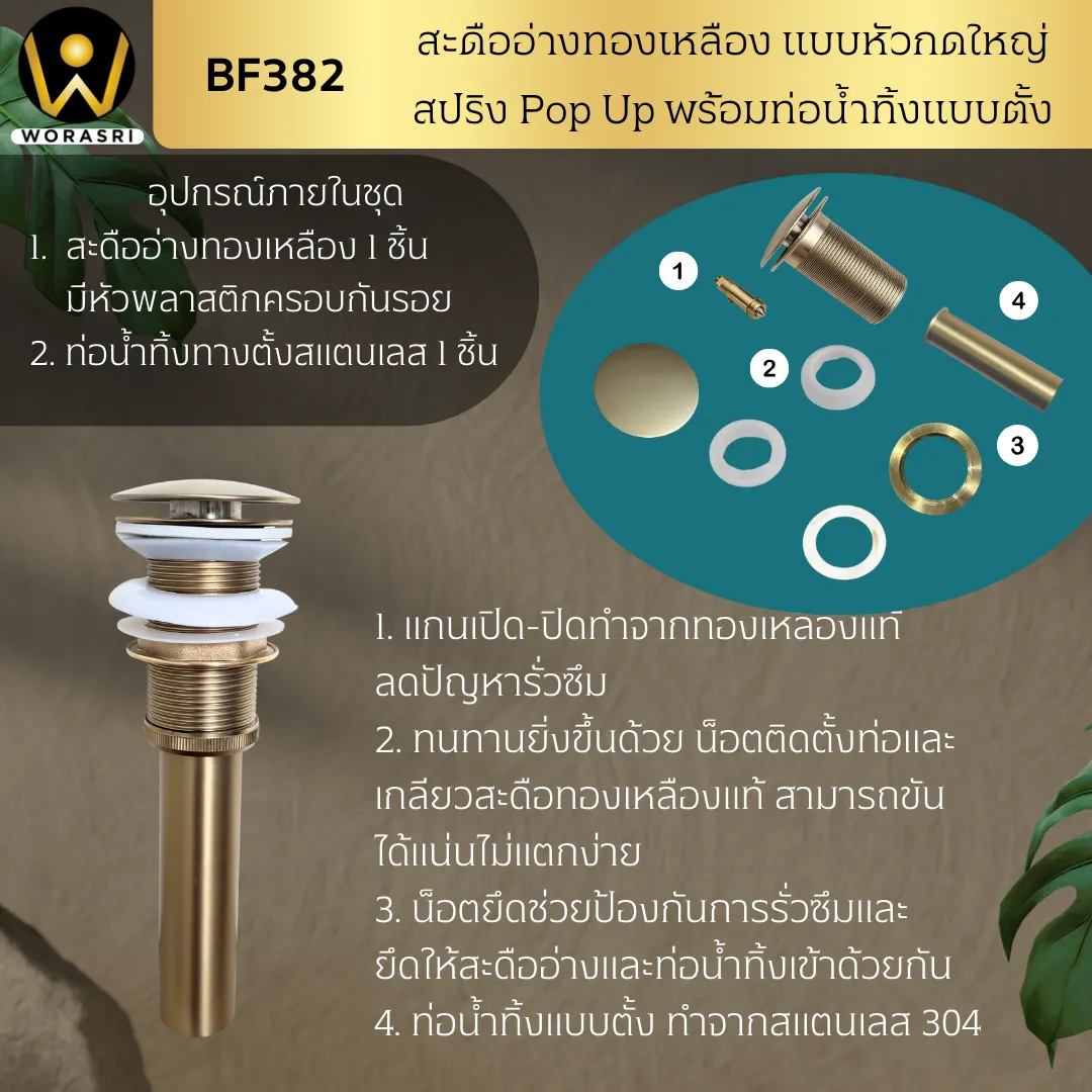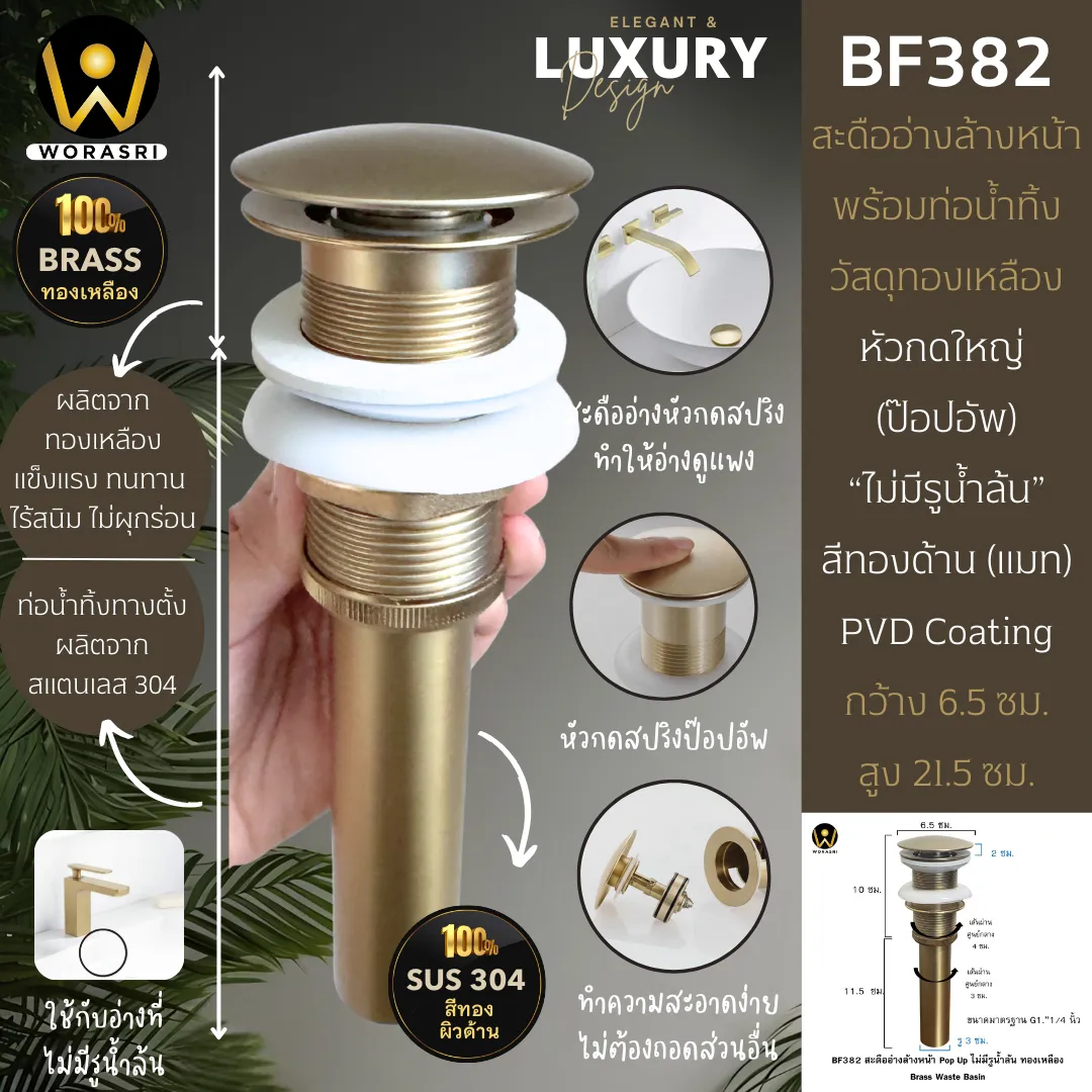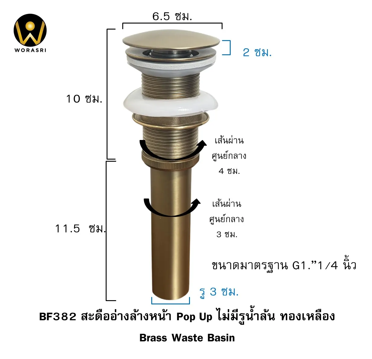 รายละเอียดสินค้า สะดืออ่างทองเหลืองแบบกดหัวใหญ่ไม่มีรูน้ำล้น รุ่น BF381 และ BF382