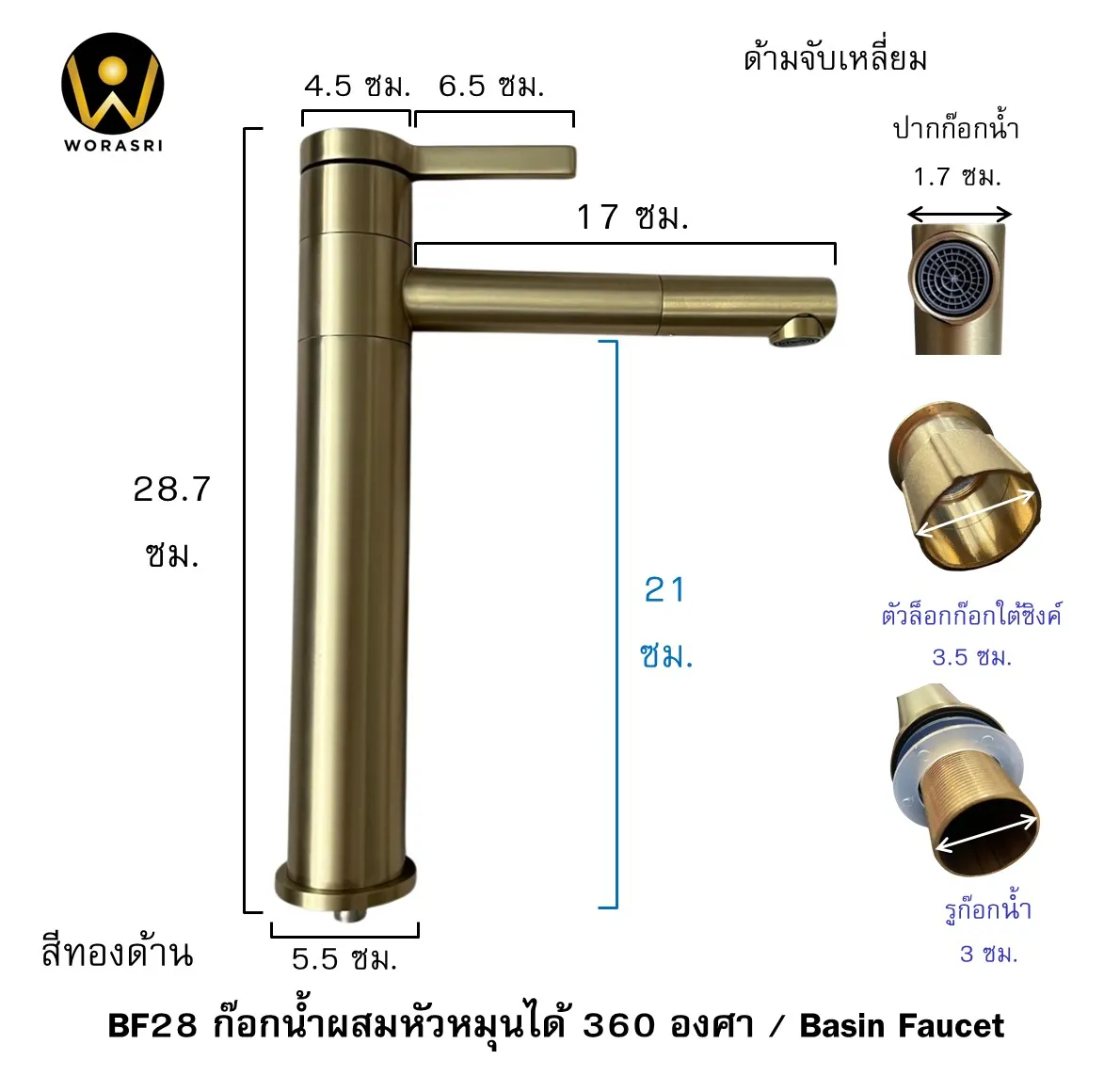 - ก๊อกสูง 29 ซม. ก้านพวยก๊อกยื่น 17 ซม. (เหมาะสำหรับอ่างวางบนเคาน์เตอร์และอ่างฝัง)
