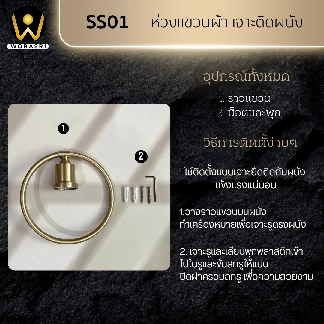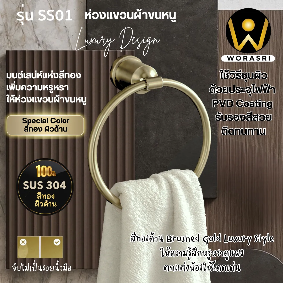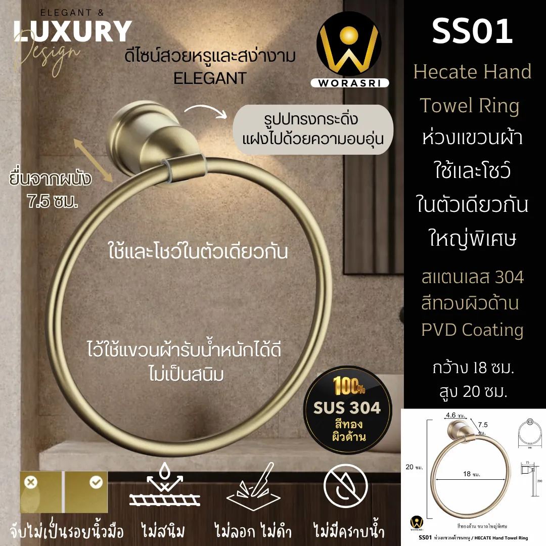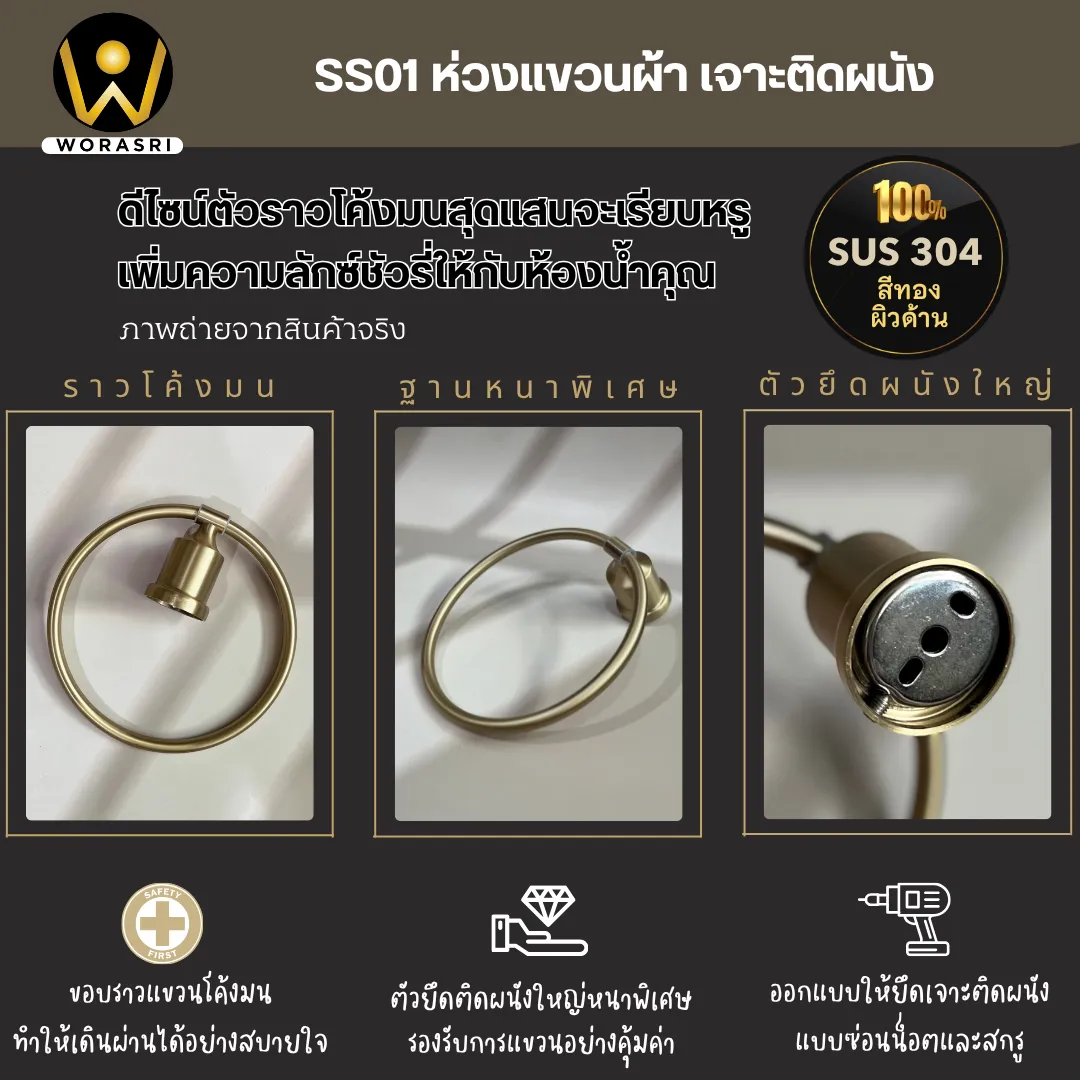 ห่วงแขวนผ้าขนหนูห้องน้ำ ห้องครัว เจาะผนัง สแตนเลส 304 สีทองด้าน SS01 Towel Ring