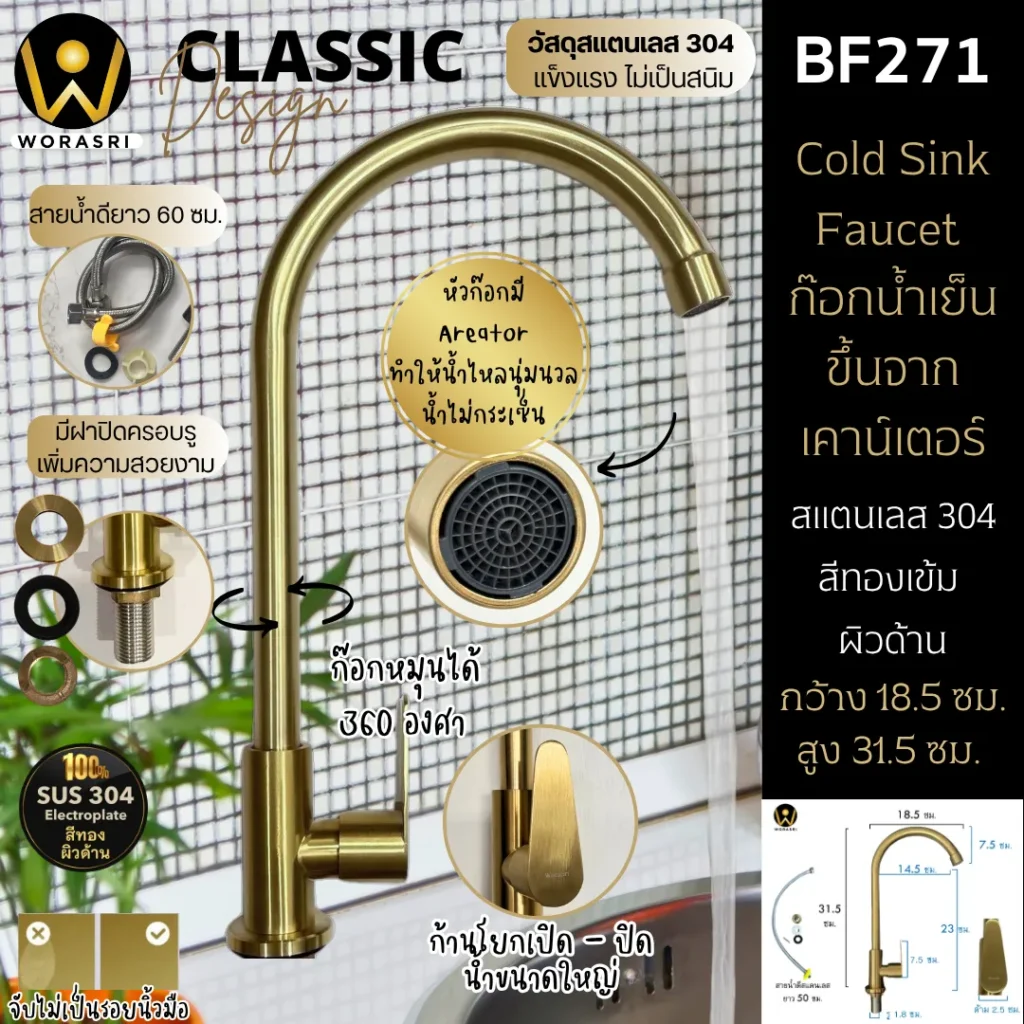BF271 ก๊อกซิงค์น้ำเย็นเคาน์เตอร์ สแตนเลส 304 คอหงส์ตัว U คลาสสิค (Swan Kitchen Sink Faucet) ก๊อกซิงค์ล้างจานสีทอง